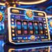 Mesin slot digital futuristik dengan layar holografik di dalam kasino modern yang terang dan berwarna-warni.